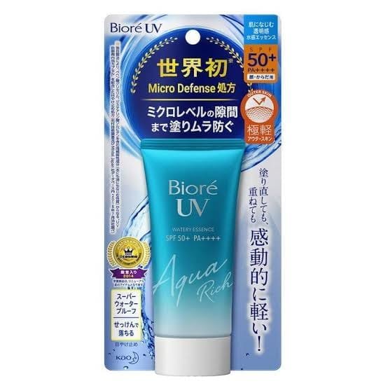 About This Item: Biore UV Aqua Rich Watery Essence SPF50 PA ++++ 50g applies the world’s first exclusive technology “Micro Defense – Micro-blocking film” to provide perfect sun protection without stickiness while creating a super light feeling on the skin. Especially with the texture of the essence in the form of a transparent water film, it is easy to spread evenly, and quickly absorbed, helping create a feeling of freshness with moist, smooth skin like silk.