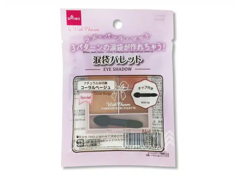 - Daiso WithCharm Tear Bag Palette (Coral Beige) is a budget-friendly eye palette designed for creating “aegyo-sal” (cute under-eye) makeup.